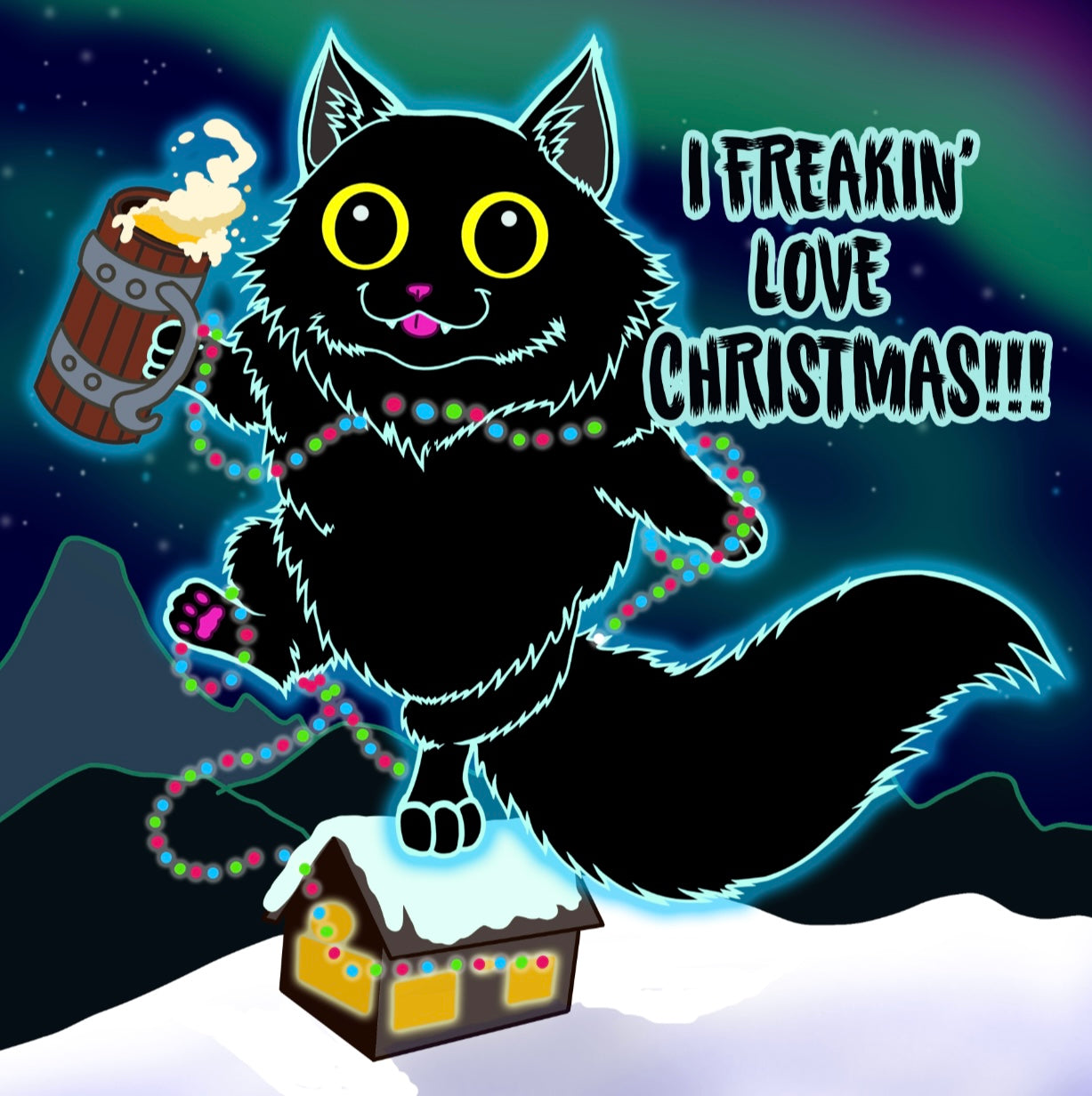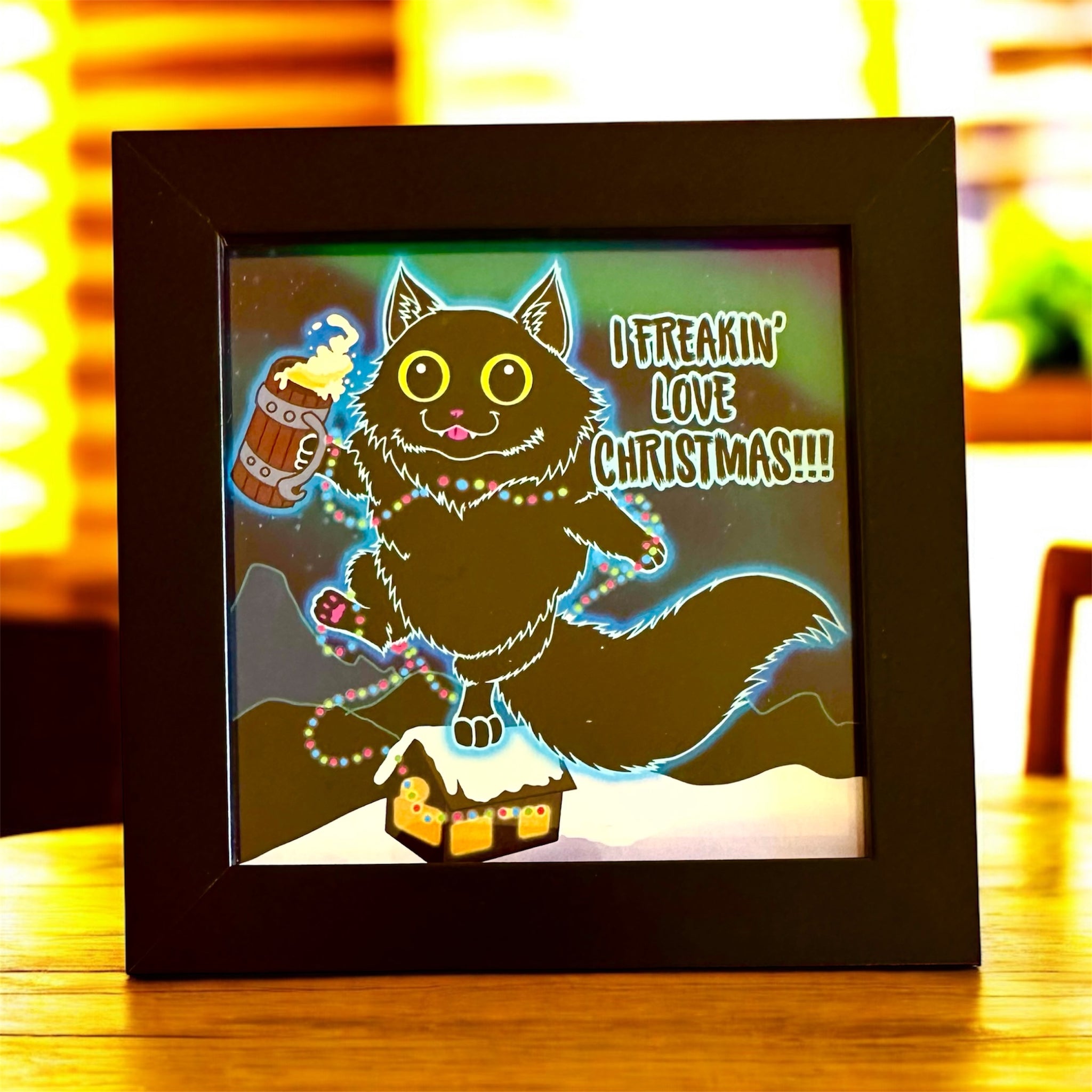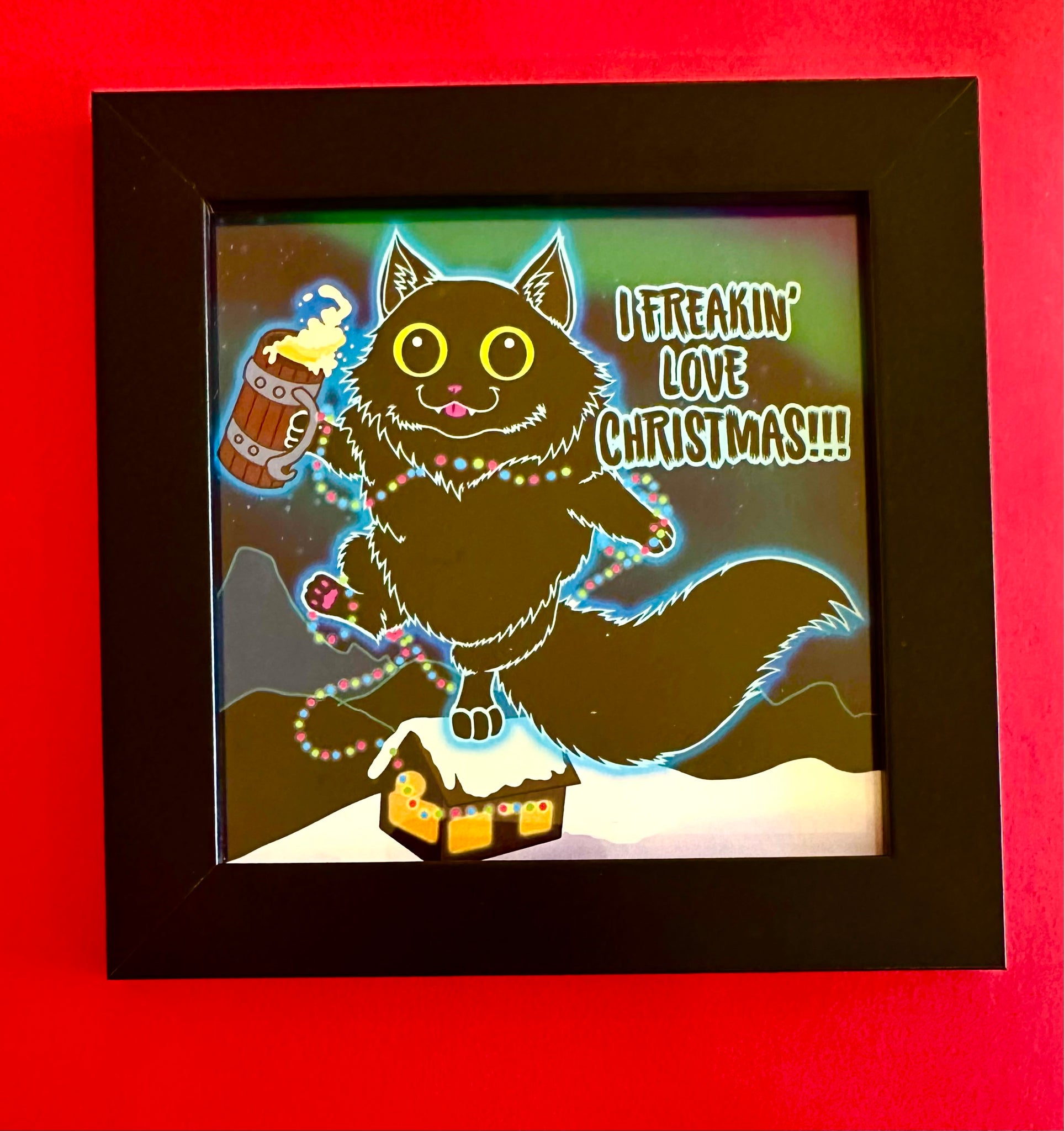 Yule cat with beer! I freakin love Christmas! Black kitty kitten white elephant gift monster Cryptid Funny meme - 5x5 inches Framed Album Cover Styled Art print!